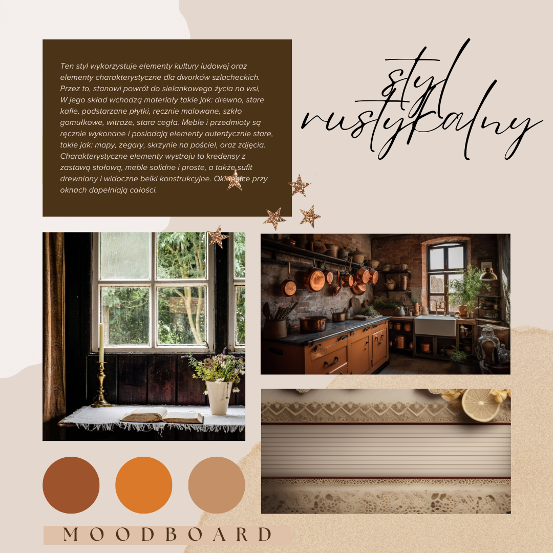W styl rustykalny świetnie wpisują się aranżacje czerpiące z lokalnego folkloru. Zakopiański klimat przenoszony jest do wnętrz prywatnych domów w postaci motywów parzenicy, ozdobnego rzeźbienia sosrębów- belek stropowych, łyżników. Styl łowicki to głównie barwne wycinanki i hafty.